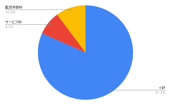 サービス料は本来は固定で10%、ただし合計金額からの比率で見ると8.2%。配送手数料は10%超えとなっていて、合計金額からみると配送手数料比率が高いことがわかります。