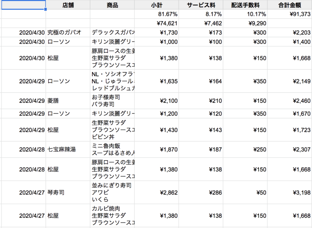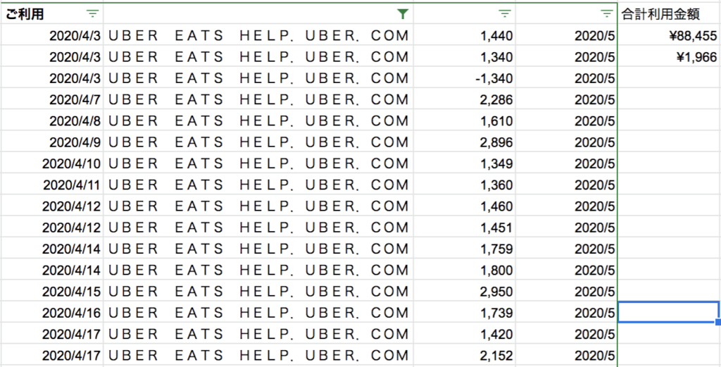 Uber Eatsの利用金額とサービス料・配送手数料の内訳